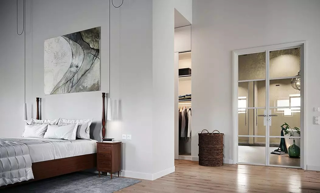臥室可以充分利用房間的拐角處打造衣帽間,如把臥室床頭前移1.2米,在后面設計一個小型衣帽間。臥室的床對面也可以設計成開放式衣帽間,搭配簡潔的玻璃推拉門設計,非常方便實用。