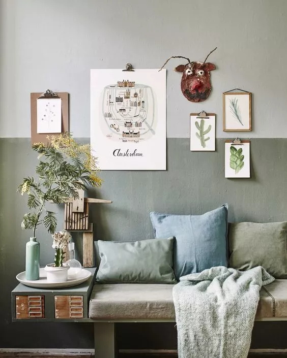 怎么做到的呢?比如下面這張圖中,鼠尾草綠灰的墻面好像變成了沙發(fā)的靠背,同時(shí)又如空間的畫框一般把人的目光吸引過來(lái)。