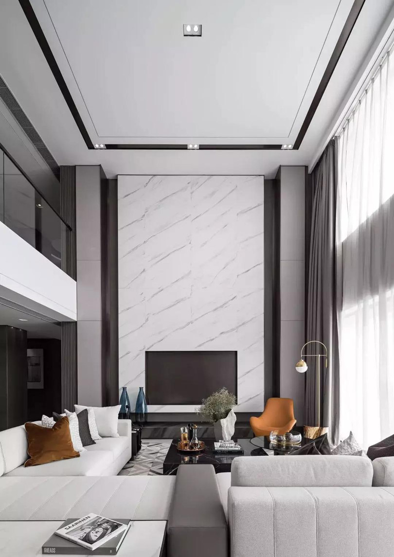 挑高空間設(shè)計吊頂,一般需要搭配燈飾以及單層/多層的裝飾線條進(jìn)行修飾。