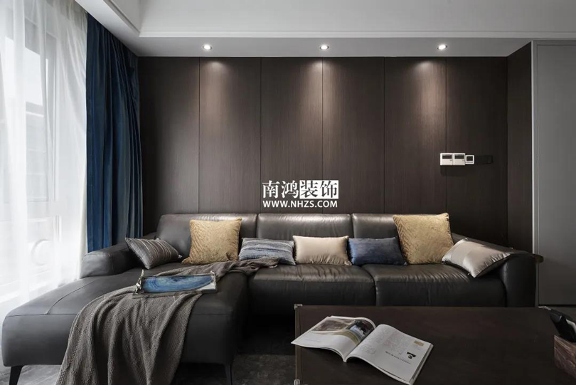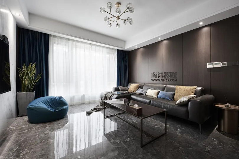 客廳通鋪石紋地磚,黑色皮質沙發搭配方形現代茶幾,背景墻選用大面積KD板包覆,使得整體風格簡潔明快,大氣爽朗。
