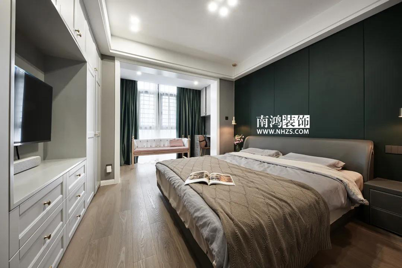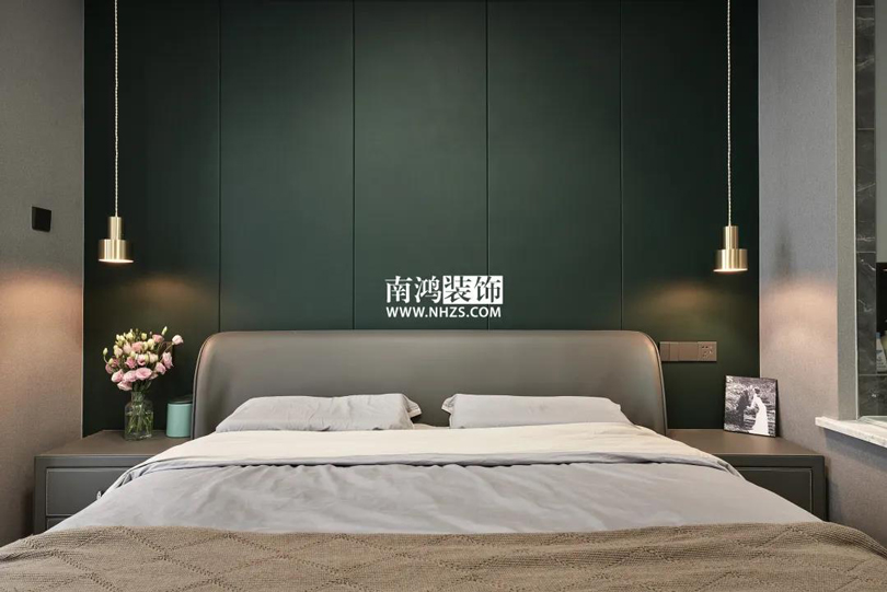主臥內包進陽臺,增加采光,額外劃出了一塊休閑與工作的地方。室內背景墻采用墨綠色硬包,結合棕色的床品,營造放松而舒適的休息環境,兩側的金屬材質吊燈點綴出小輕奢格調。