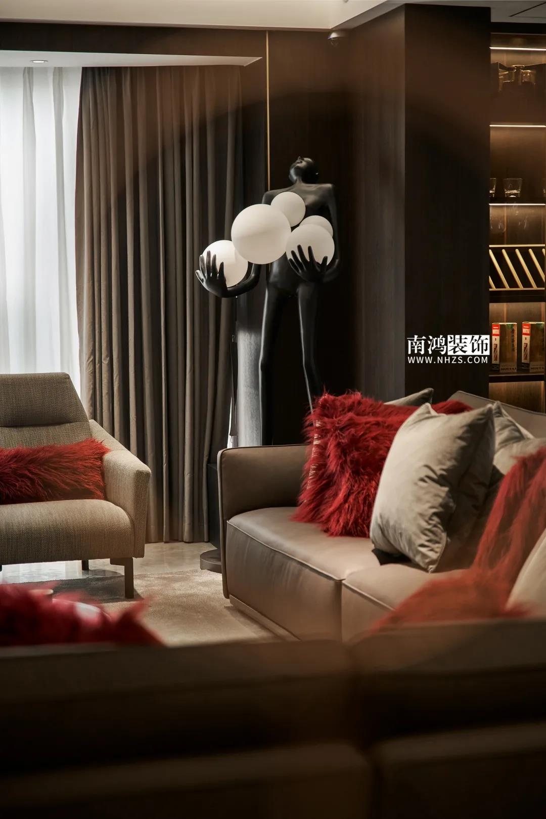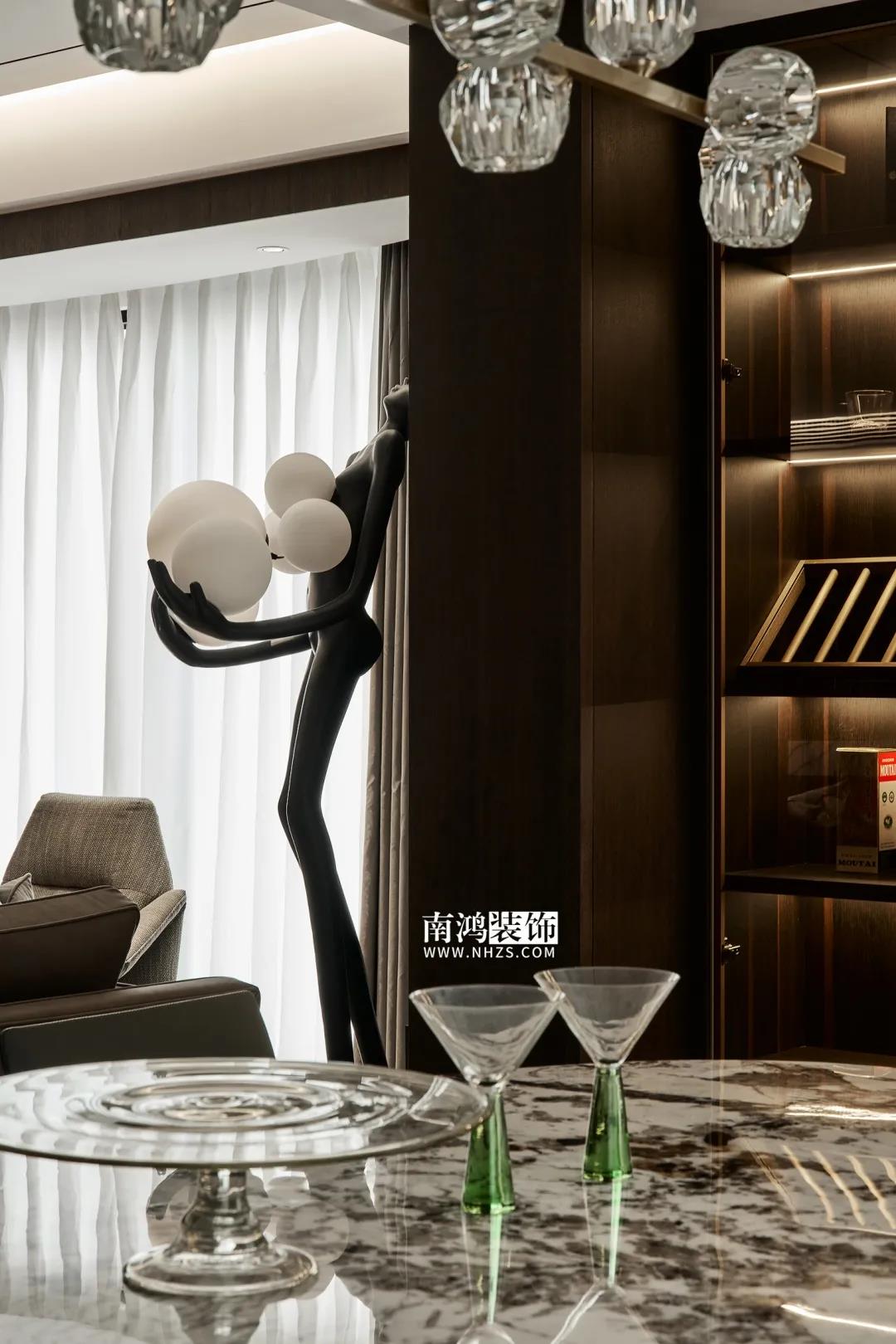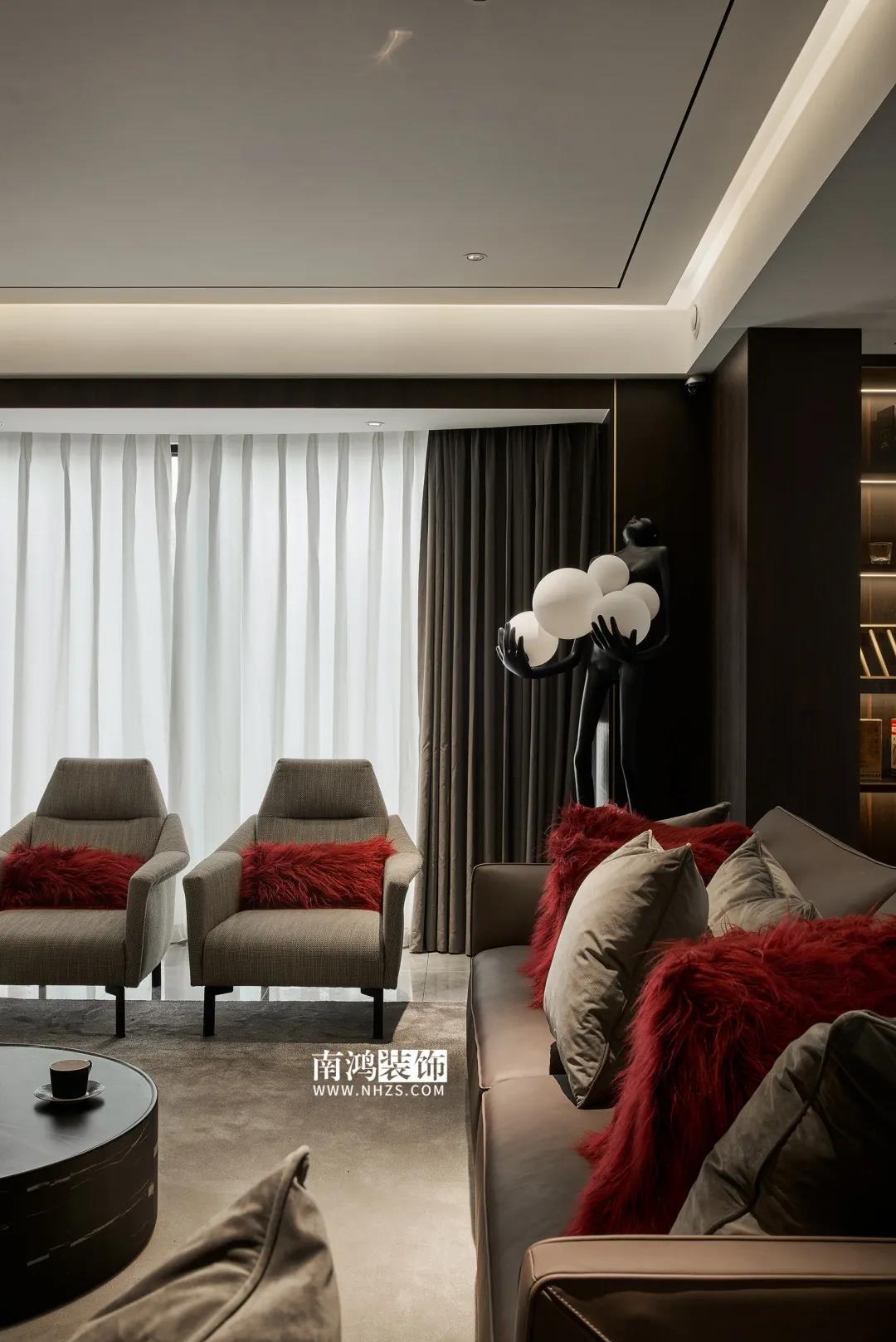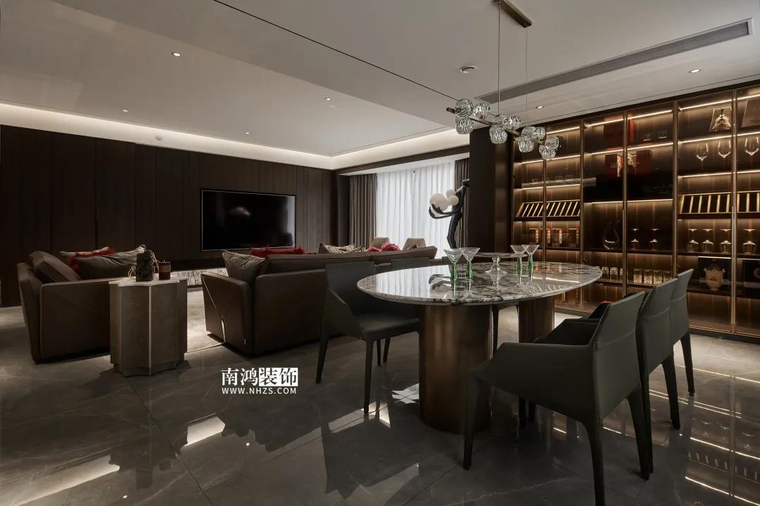 【項目·信息】 地址 / 華瑞晴廬 戶型 / 三室兩廳 面積 / 200㎡ 風格 / 現代極簡 設計施工 / 浙江南鴻裝飾 01. 客戶需求 本案的男業主是位個體戶老板,事業有成,性格熱情開朗,十分好客,由于夫妻二人目前沒有小孩,父母也是偶爾來住,對房間的需求并不大,因此戶型從原來的5房3衛改為了3房2衛,并盡可能擴大客餐廚的面積,來滿足業主的會客需求。 02. 裝飾亮點 “人內在的細膩與深切的情感,需要與之對等的空間來承載。灰與黑,看似簡單平靜,卻蘊含著無窮的魅力。” 屋主偏愛深色系,因此設計師精細地調配深色在空間中的比例,運用護墻板、大理石、皮革等質感材質,借助燈光效果,為他們打造了這個頗具神秘感和高級感的暗色空間。 03. 戶型分析 & Design Drawing 1、進門靠墻增加一組鞋柜以提升玄關收納。 2、原戶型中的兩個房間合并成餐廳區域,并與客廳打通,使人一進屋便能感受到公空間的開敞氣勢。 3、原有的一個衛生間改造成衣帽間,將主臥打造成一個包含休閑區區、寬敞主衛、衣帽間在內的豪華套間。 04. 設計落地 很多人酷愛深色 與其說天性愛低調 不如說是深色所散發出的靜謐氣質 恰好與渴求安寧的內心產生了共鳴 灰與黑打造的客廳 洋溢著高級感與神秘氣質 豐富的紋理、材質變化 在空間內形成一種微妙的和諧 熱情張揚的紅 與深沉神秘的黑 兩相對立的色彩語言 帶來十足的視覺沖擊力 & Dining Hall 黑色的皮革餐椅 搭配高顏值的大理石餐桌 打造精致的多人用餐環境 餐廳做整面酒柜 置入暖黃燈帶 既是酒水的完美收納 又是一處身份品味的象征 玄關往客廳的過渡區域 安置精心打造的吧臺 成為過道口的一處個性風景 也是日常的簡餐區 廚房擁有標準的U形操作臺 儲物充足,動線流暢 深色櫥柜與臺面 完美塑造一體式空間感 主臥承襲整體的暗色風格 深沉的灰黑色打底 傳達平和寧靜的空間情緒 豪華的主臥套房 包含休閑區、主衛與衣帽間 擯棄了所有多余的裝飾 只保留每一件必需的家具 獨立衣帽間設計 黑色柜體內藏有燈帶 酷雅有型 純粹的黑構建理性的質感 透過白色紗簾進入室內的日光 讓客臥空間 簡潔中帶上了變化 次臥床尾 安排書桌椅與書架 灰色的墻布 排除一切冗余 力求沉穩大氣 經過戶型調整 主衛內部更顯寬敞 浴缸與淋浴區分居兩側 功能區的豐滿 是給生活最大的舒適 次衛風格與主衛相似 石紋瓷磚搭配木質臺盆柜 淋浴區內設置壁龕 視覺舒適,實用性強