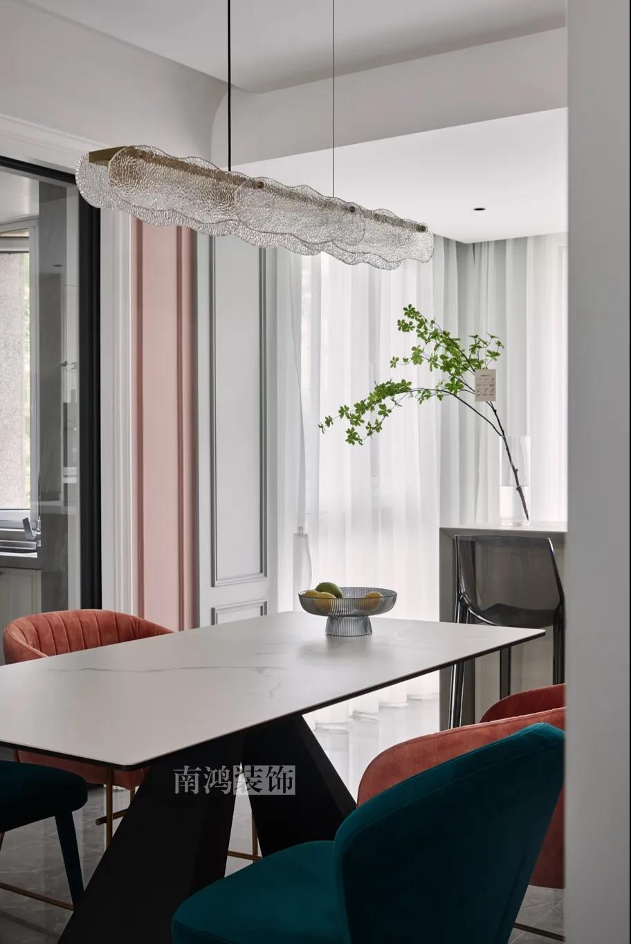 01. 客戶需求 本案的屋主非常喜歡小美式風(fēng)格的清新自在,又向往著現(xiàn)代簡(jiǎn)約所傳達(dá)的生活理念,所以設(shè)計(jì)師依照他的喜好,將兩種風(fēng)格元素巧妙糅合,讓整體空間在浪漫優(yōu)雅的情調(diào)中傳遞出主人的獨(dú)特品味。 02. 裝飾亮點(diǎn) REFRESHING 擯棄了粗暴的材質(zhì)堆砌,將小美式與現(xiàn)代簡(jiǎn)約巧妙結(jié)合在一起,色調(diào)上選用低飽和度的高級(jí)灰與柔和的莫蘭迪色,致力于呈現(xiàn)一個(gè)唯美純粹、具備高級(jí)感的美學(xué)空間。 03. 戶型圖 04. 設(shè)計(jì)落地 客 廳 客廳以高級(jí)灰為主基調(diào),低飽和度的特性使得它具備很強(qiáng)的包容性。 電視背景將美式的經(jīng)典線條護(hù)墻與利落的大理石磚組合,沙發(fā)背景則做了木護(hù)墻隱形門處理,配以簡(jiǎn)單干凈又不減細(xì)節(jié)的吊頂,既實(shí)現(xiàn)了兩種不同風(fēng)格元素的結(jié)合,又能讓造型為居家功能服務(wù)。 靠近陽臺(tái)擺放一把亮麗單椅,電子壁爐內(nèi)躍動(dòng)著溫暖的火苗,成為美妙的休憩一角。 節(jié)制而有意蘊(yùn)的設(shè)計(jì)手法,賦予空間最具詩意的內(nèi)涵表達(dá)。 開放的領(lǐng)域中,客餐之間連貫而又相對(duì)獨(dú)立,在敞闊的尺度中讓主人感受到家的舒適。 餐 廳 餐廳,是讓人走近便頓覺眼前一亮的空間所在。花朵般嬌嫩的煙粉色,是莫蘭迪色系中超有存在感的一派,又如晚霞,純凈美好,撲面而來便是夢(mèng)幻與浪漫的氣息。 餐廳處還添加入西廚的功能,讓廚房實(shí)現(xiàn)多功能化,同時(shí)弱化了原區(qū)域的狹長(zhǎng)感。 過 道 “人生忽如寄,莫辜負(fù)茶、湯和好天氣。”清朗平和的過道景致,自給人一種寧靜的深邃感受。 臥 室 臥室刪繁就簡(jiǎn),通過淺色的床品與干凈的硬包背景,營造簡(jiǎn)約純粹的清韻。 兒童房是一個(gè)多姿多彩的空間,活潑的星星圖案,多種低飽和色調(diào)搭建的背景墻面,整體氣氛輕松愉悅,作為一個(gè)成長(zhǎng)型空間來說也充滿著可塑性。 衣 帽 間 純白的視象,抽離了所有多余的表達(dá),兩側(cè)衣柜默默擔(dān)當(dāng)著收納的使命,井然有序地包容著一切冗雜。