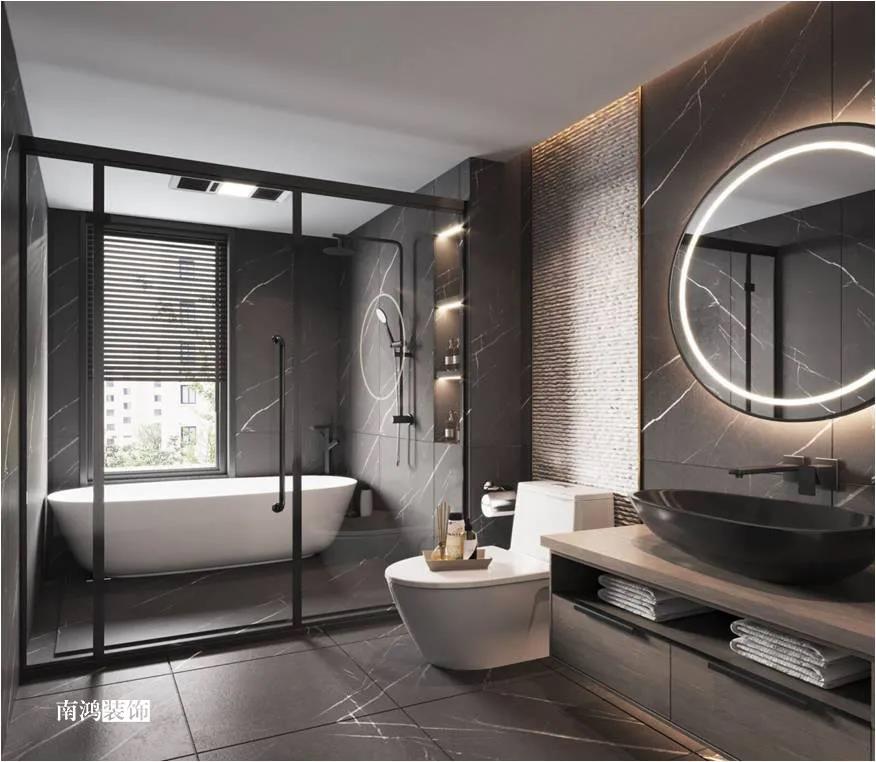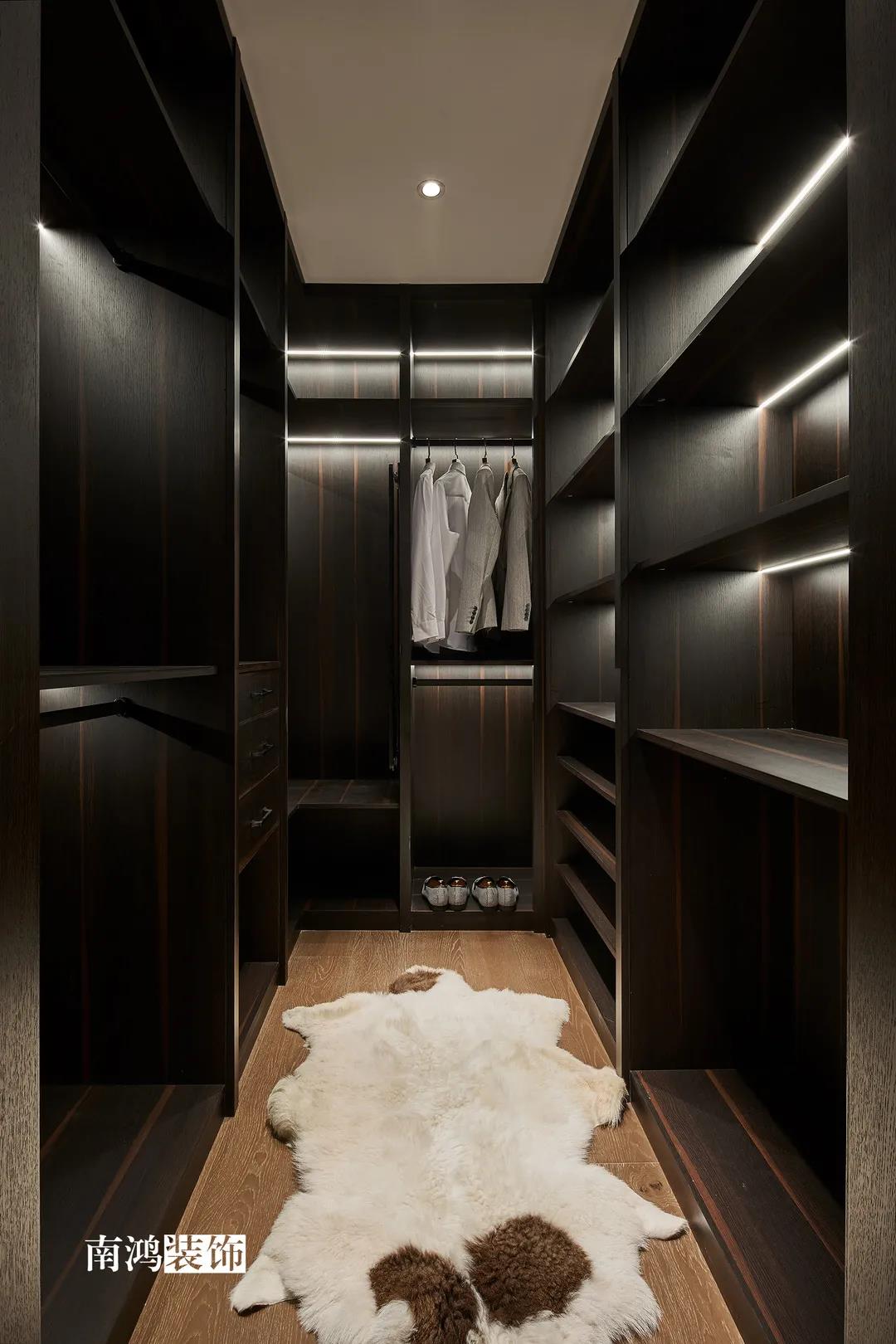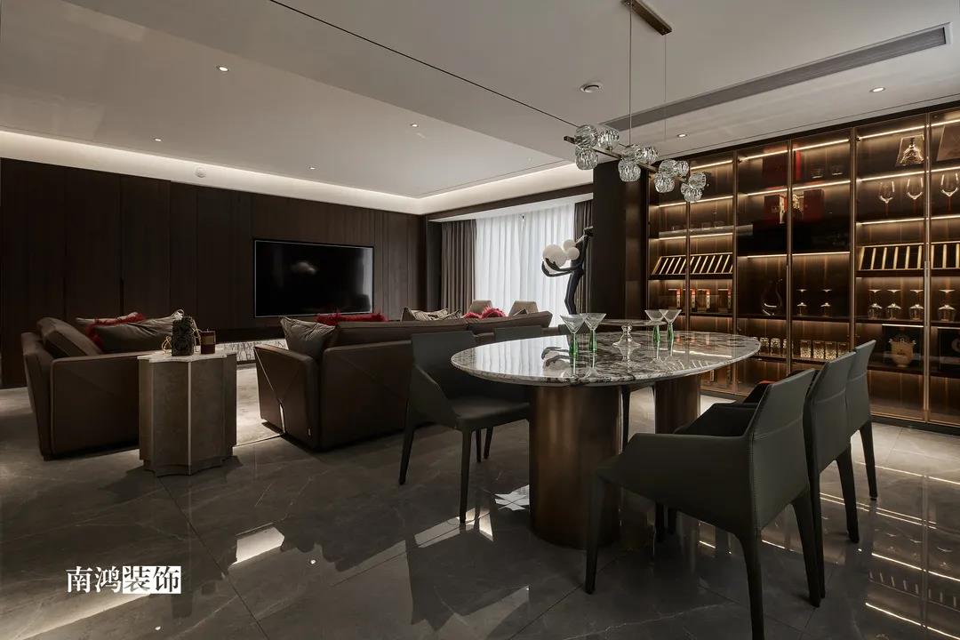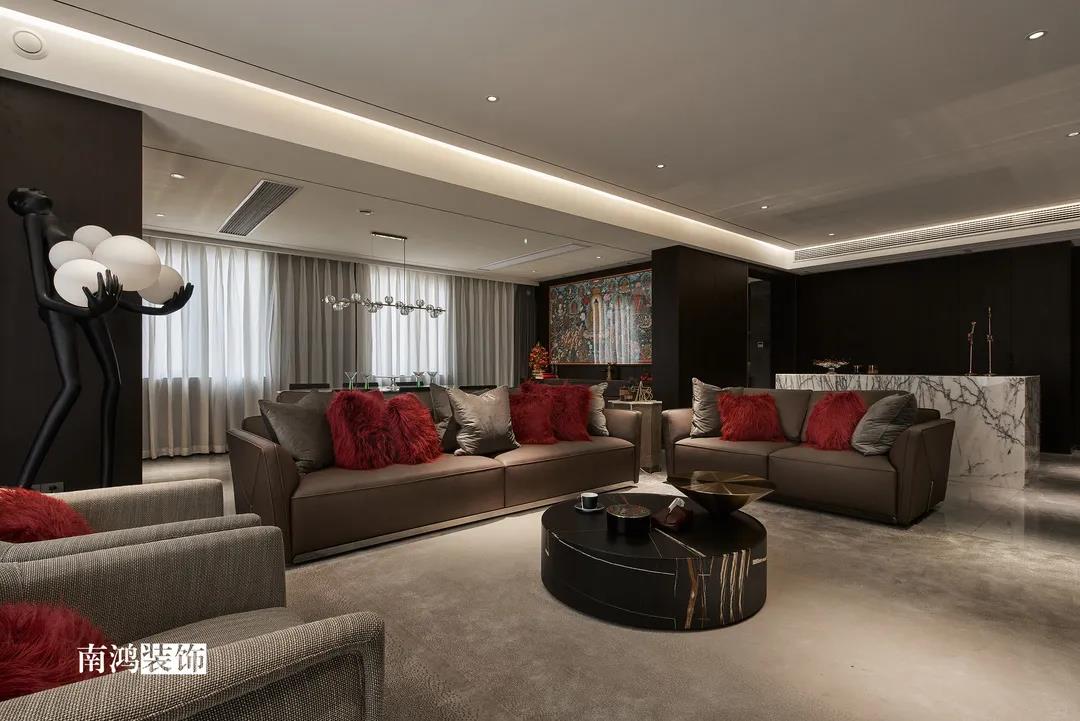 色彩上主要依照男主人的喜好,選擇了深色的石材與木飾面,點(diǎn)綴上深紅色的軟裝元素,整體搭配不會(huì)太過(guò)沉悶,再結(jié)合柔和的燈光用以打造空間氛圍感,完美詮釋“紅與黑”主題!