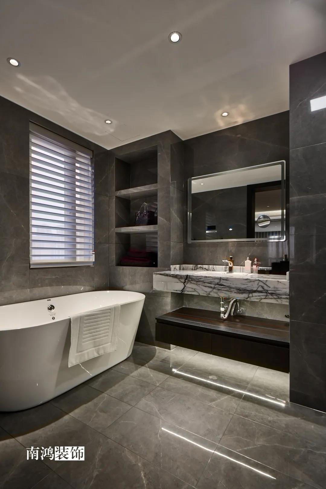 室內(nèi)色彩以黑白灰色調(diào)為主,冷色調(diào)給人安靜的感覺(jué),適合屋主一個(gè)人靜下心來(lái)看書、品茶,同時(shí)也放大了空間。裝飾上采用的大理石、金屬嵌條、銀鏡等元素,也有利于營(yíng)造全屋的輕奢氛圍。