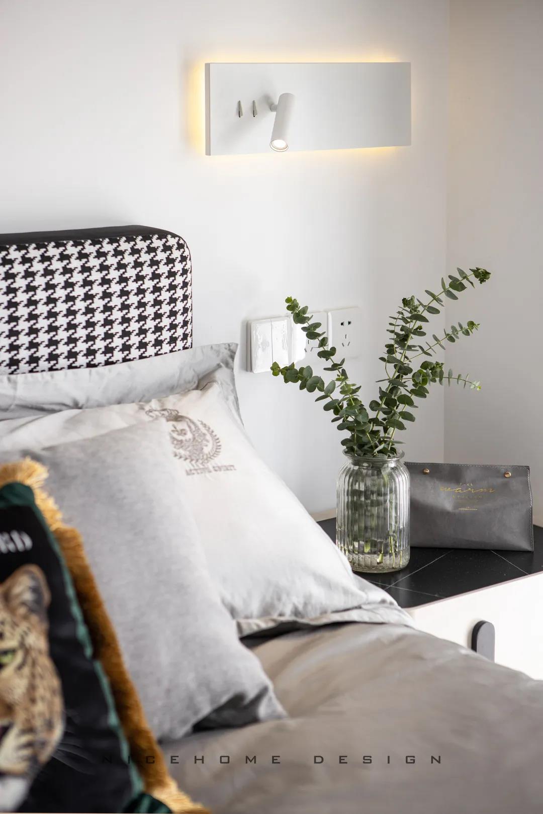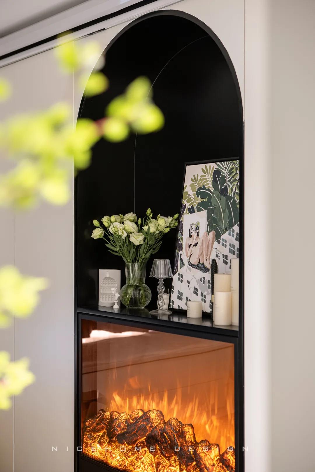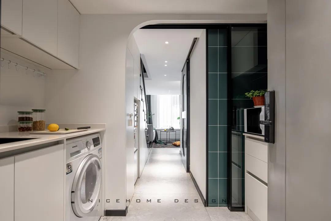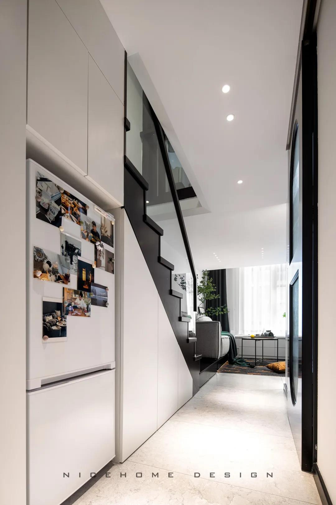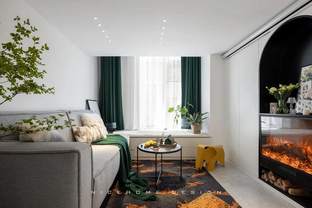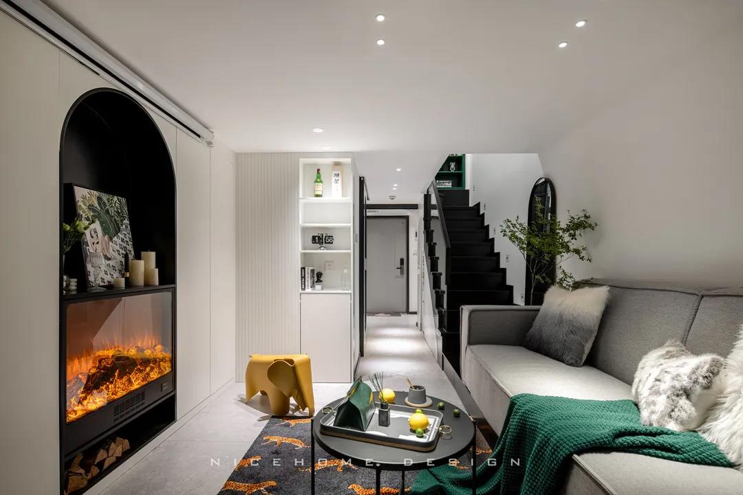 ? 案例信息 地址:時光里 戶型:Loft 面積:47.5㎡ 風(fēng)格:現(xiàn)代都市 設(shè)計施工:浙江南鴻裝飾 ? 戶型分析 不到50方的屋子,還是設(shè)計出了三房的功能,以滿足業(yè)主的加班需求及父母偶爾小住的客臥需求。底樓只有一扇窗戶沒有陽臺,所以設(shè)計師在臨窗位置做了挑空,最大化保留居室采光。 進門即是玄關(guān)與廚房的位置,小小的開放式廚房供兩個人的日常用餐還是很方便的。 小戶型因為面積有限,所以角角落落的地方都不能浪費。白色的收納柜包容所有雜物,體積較大的冰箱、洗衣機也都做了嵌入,過道的門洞則設(shè)計成半拱形,一系列小細節(jié)便能讓我們感知到主人對家的用心。 Loft公寓戶型,典型的只有一扇窗沒有陽臺,設(shè)計師便在此做了一個挑空,讓采光與視野都能盡量打開,避免局促。 公共區(qū)域比較狹小,又得兼顧到收納,便以柜體+壁爐的形式做背景,投影幕布取代電視機,讓美學(xué)與實用功能盡可能達到平衡。 墨綠色的點綴優(yōu)雅不失活力,壁爐內(nèi)跳動的火焰帶來家的溫度。小象形狀的椅子、壁面的線條切割、清新的綠植花卉,還有風(fēng)格統(tǒng)一的沙發(fā)茶幾和地毯,都是室內(nèi)的點睛之筆。 那些對生活充滿熱情的人,內(nèi)心便是詩,外現(xiàn)出來,慢慢具象到了家的模樣之中。 小角落擺放一面弧形鏡,既是元素上的呼應(yīng),也巧妙放大了空間。 啞黑色的扶手與階梯,充分展現(xiàn)都市生活的現(xiàn)代格調(diào)。 由樓梯望向客廳的精致小景,窺見家的脈脈柔情~ 臥室背景留白,低飽和色彩創(chuàng)造舒眠環(huán)境,千鳥格紋自帶經(jīng)典美感,光源都被設(shè)置得“小心翼翼”,仿佛不忍打擾這里的寧靜。 床頭深沉的墨綠色,與床品的淺綠形成了具有層次感的優(yōu)雅格調(diào),精心挑選的機械金屬燈與整體氛圍形成反差,增添了一絲趣味感。 衛(wèi)生間選擇灰色主調(diào),墻面鋪貼灰白色結(jié)合的孔雀羽瓷磚豐富視覺效果,壁掛式馬桶省空間還便于清潔。