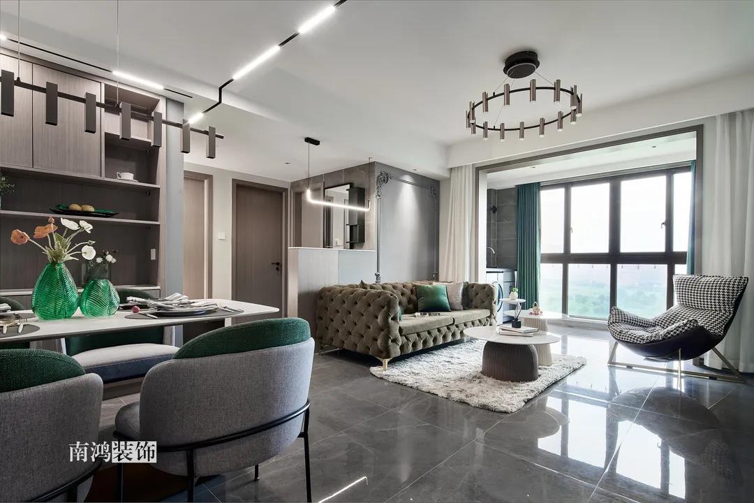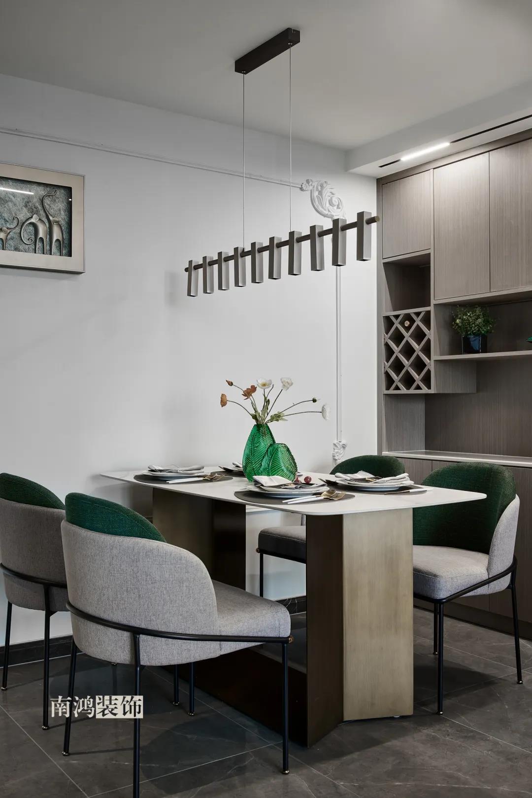 客餐廳一體式設計是小戶型的常見選擇,也更符合現代人的生活習慣。灰白主色保持整體低調,局部墻面以飽和度高的綠色乳膠漆涂刷,空間被提亮不少。