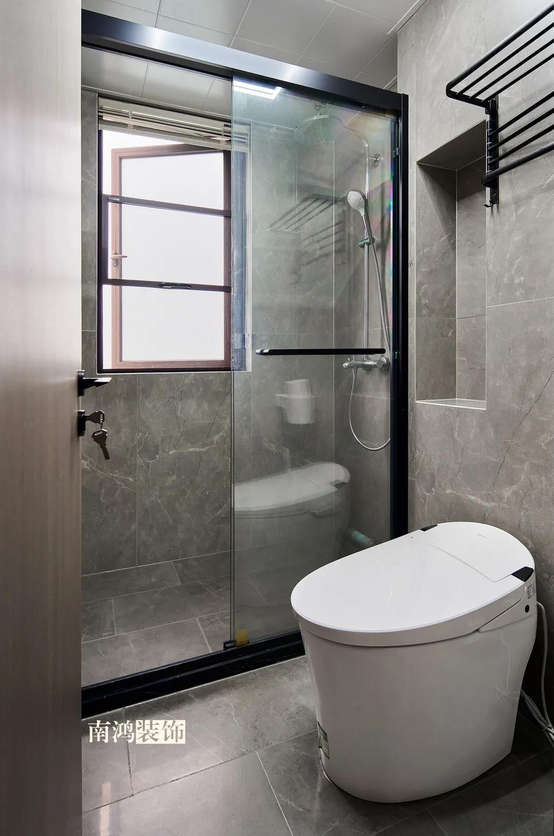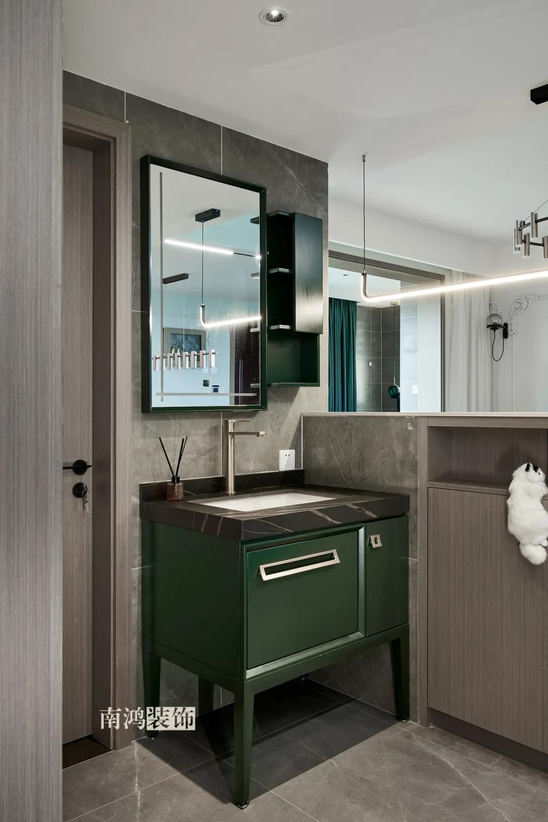 衛生間將干濕區域分離,洗漱臺盆柜、壁柜與旁邊打造出的半高柜體可將瓶瓶罐罐都收入其中,保證視覺上的清爽。